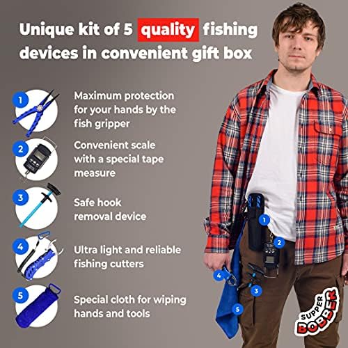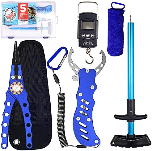 [5 PCS] + WATERPROOF BOX, FISHING TOOLS SET. Aluminum Fishing pliers – 2.1 x 7.5 in. Fish Gripper – 1×7 in. Fish hook cleaner – dehooker fish weight scale digital Microfibra – 11×12 in. Water Resistant Box – 12x8x2.5 inches. (Not a basic container box) THE BENEFITS OF OUR SET. 1. An ideal present for any angler. 2. Defense of your hands, Fish will no longer fall off, that makes fishing more comfy. 3. Hassle-free box for storage or transport. 4. All products are light-weight and developed to be quickly run with one hand. 5. This set was made by expert anglers. 6. This is not a low-cost and basic set. All products in this set are of high superior quality. FINEST PRESENT. It will be an excellent present for your male angler or any other individual who loves fishing. A resilient and lovely box will make your present a lot more practical and enjoyable to offer. The fishing set includes whatever you require, and there is no longer any point in gathering the present individually, and the high quality of the tools will leave the most enjoyable sensations from use. Hassle-free storage and transport in our box, your products are no longer be lost. FISH WILL NO LONGER FALL – utilizing fish grip you do not need to stress over your hands and your catch will no longer slip off, simply hook the fish by the mouth and boldly raise it out of the water. HAND SECURITY & LESS DAMAGE – Fishhook Cleaner keeps your fingers from hooks. Do not stress over any sharp-toothed fish like trout, perch, and so on. Quickly eliminate hooks, even deeply cut ones, with less damage to fish. Keeping the practicality of industrial fish or little fish is really crucial to keep a well balanced environment. SALTWATER RESISTANT FISHING EQUIPMENT. With the fishing pliers, you can quickly eliminate the bait and split ring, and likewise cut the braided wire, capture your sinker.