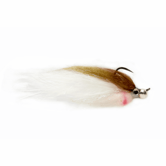 The Tatical Jig Zonker is a very efficient sculpin/ little banner connected with bunny strip body and collar. It is connected on a jig hook and flights “punctuate” this is particularly efficient when fishing sculpin patterns deep, bouncing them along the bottom. The Tactical Jig Zonker can be found in a size 12 in a natural bunny color along with olive.