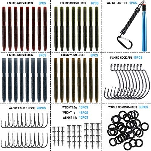 133PCS CRAZY WORM LURE SET – Consisting Of 1 Goofy Rig Tool, 32pcs 5.5″ Goofy Worm in 4 color, 10pcs Goofy Weedless Hooks, 20pcs Worm Hooks, 30pcs crazy rig O-rings, 40pcs weights and a plastic divider storage case. Great for newbies or skilled anglers.